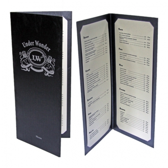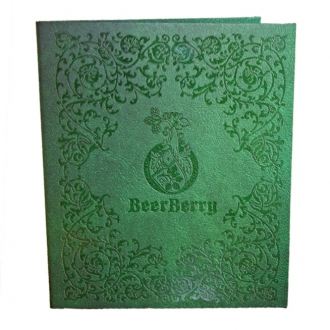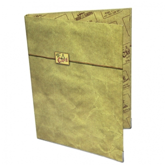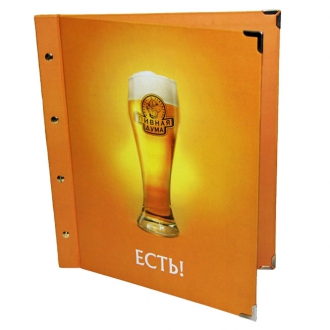 Начнем с обложки. В качестве обложки для меню чаще всего выступает кашированная картонная папка или папка из кожзама. Толщина картона, используемого при производстве таких папок, составляет от 1,5 до 2 мм, что позволяет надежно защитить внутренний блок. В меню с твердой обложкой внутренние листы долго будут оставаться в хорошем, "рабочем" состоянии.